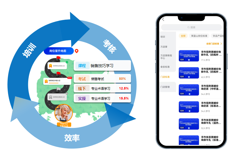 万店掌AI培训系统支持上传前厅、后厨等岗位专属图文、视频资源,方便新人随时随地学习并通过AI考核快速上手。后厨员工可按视频实操菜品制作,还能向AI助手提问课程内容,随时了解菜品知识;前厅员工借助AI陪练模拟客户沟通,巩固话术、提升应变能力。系统依据培训进度与考试成绩等生成个性化成长路径,助力提升员工留存率。AI培训通过在线学习考试的方式既降低企业培训成本,又实现了员工全周期陪伴式成长,从而提升门店服务水平。