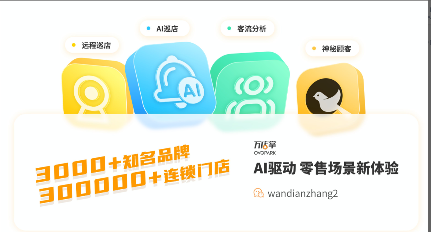 万店掌以AI场景识别+SaaS运营平台为架构基础,构建了高效巡店、神秘顾客、客流分析、AI分析、视频追溯、智能信发、数据分析等针对泛零售连锁企业的全链路数字化管理平台,并针对全行业提供开放平台。